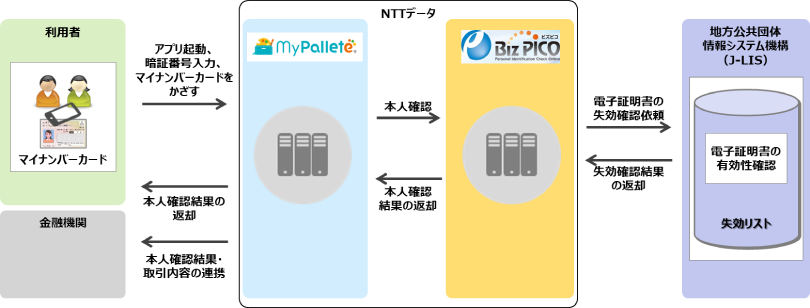 - 注1 犯罪による収益の移転防止に関する法律施行規則 第六条1項1号のワ。マイナンバーカードのICチップに搭載された公的個人認証機能(JPKI AP)を活用し、NTTデータの署名検証代行事業「BizPICO」と連携することで、非対面で、安心かつ安全なサービスの提供が可能となります。公的個人認証機能(JPKI AP)とは、地方公共団体情報システム機構が提供するマイナンバーカードのICチップを利用した本人確認サービスです。