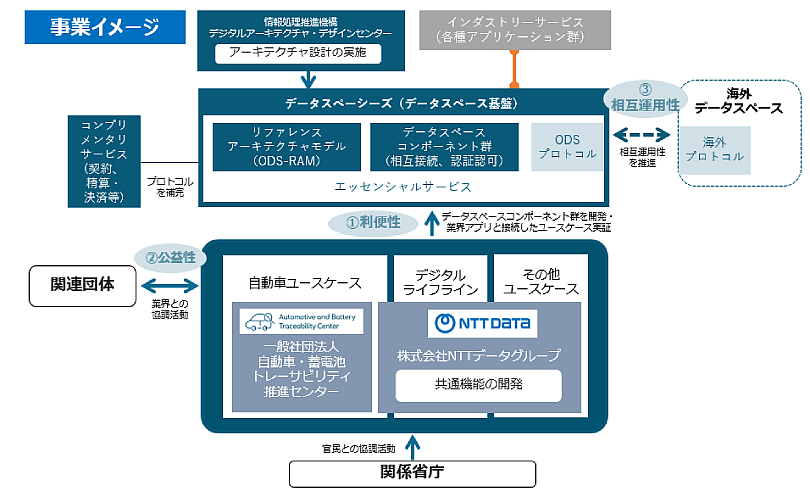 一般社団法人自動車・蓄電池トレーサビリティ推進センターとNTTデータグループは、これまでウラノス・エコシステムの先行ユースケースである蓄電池サプライチェーンでのカーボンフットプリント算出に向けた「バッテリートレーサビリティプラットフォーム」を共同で提供しており、これまでの知見を活用し、円滑・安全にデータ流通できる利便性の高いデータ連携基盤機能を提供します。また、関連する業界団体・事業者との協調活動を通じて、データスペース基盤を利用するために必要な整備に取り組み、国外との相互接続における相互運用性を確保するために、海外データスペースとも連携した取り組みを推進します。