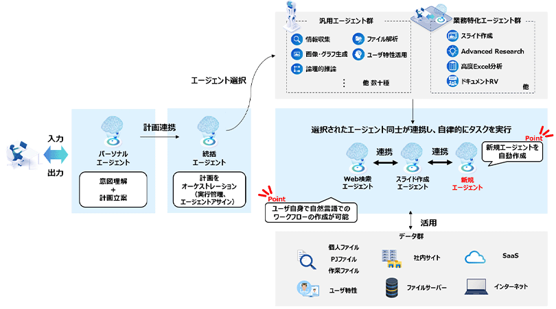 汎用エージェント群(Web検索、社内ナレッジ検索、コーディング、可視化など数10種)から業務特化エージェント群(スライド作成、Advanced Research、高度Excel分析など)まで幅広いエージェントを提供します。ユーザーの指示に対し単一のエージェントでは処理できない場合には、エージェント同士が連携し自律的にワークフローを組んで対応します。