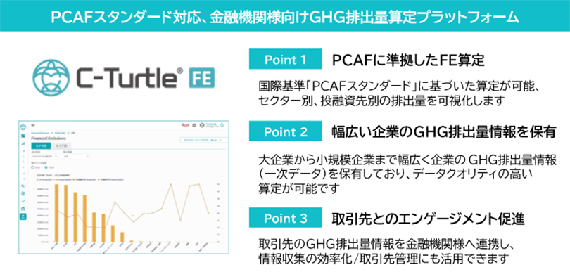 - 注1 C-Turtleは、削減できるScope3算定を実現するGHG排出量可視化プラットフォームです。一般的に、Scope3の算定は「活動量(企業の活動規模)」×「排出原単位(市場平均値)」で算定されることが多く、企業の削減努力を反映することが難しいという課題があります。C-Turtleは、Scope3の算定に、投融資先やサプライヤーの排出量の実測値(一次データ)を活用し、各社の削減努力を自社排出量に取り込むことができる「総排出量配分方式」を採用しています。これにより、投融資先やサプライヤーの排出量の可視化状況が明確になり、サプライチェーンを通じたGHG排出量の算定・削減の推進が可能となります。