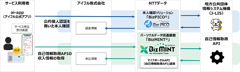 所得情報は、NTTデータのパーソナルデータ流通基盤「BizMINT」を通じて取得します。マイナポータルAPI注2の一つである自己情報取得APIと連携し、利用者の同意のもと必要な情報をアプリへ提供します。自己情報取得の際にはマイナンバーカードの券面事項入力補助APを用いて本人の基本4情報(氏名、住所、生年月日、性別)も取得します。