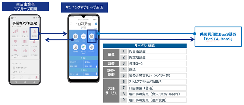 地域金融機関ではデジタル接点の拡張と新たな取引機会の創出が求められる一方、流通・交通・通信などの生活サービス事業者においては、自社サービスへ金融機能を組み込むための制度対応やシステム構築の負担が課題となっています。本取り組みでは、BeSTA-BaaSを基盤として銀行機能を生活サービスの利用体験の中に組み込み、口座開設や残高確認、振込・支払い、スマホアプリによるATM入出金などをワンストップで提供する仕組みを実現します。