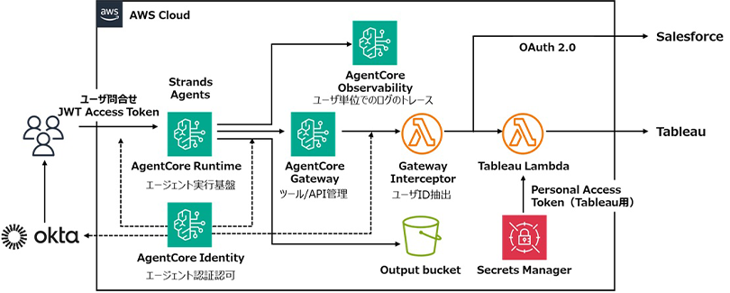 NTTデータは、SalesforceおよびTableauと連携し、自然言語による指示だけで営業データを複合的に分析できる営業データ分析エージェントを開発し、自社の実務シナリオにおいて有効性を確認しました。従来は各サービスからデータを抽出、加工、集計する工程が必要でしたが、本エージェントでは、ユーザーが自然言語で問いを入力するだけで、必要なデータの自動取得から、統合分析、レポート生成までを一貫して行います。なお、SalesforceとTableauは検証対象の一例であり、Amazon Bedrock AgentCoreのGateway機能を活用することで、さまざまな外部サービスとの連携が可能です。セキュリティ面では、Amazon Bedrock AgentCoreのIdentity機能とOktaを連携させ、OAuth 2.0を用いた外部サービス接続および厳格な認証・認可の仕組みを実装しました。