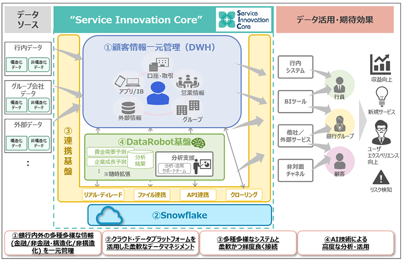 SICは、クラウド上に構築されたセキュアなデータ利活用プラットフォームであり、銀行およびグループ会社を含めたデータを一元管理し、分析やAI活用を支える環境を提供します。