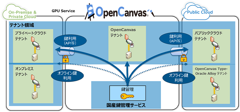 OpenCanvas内のシステムに加え、OpenCanvas Type-Oracle Alloy、GPUaaS、オンプレミス環境、プライベートクラウド環境、他社クラウド環境など、複数環境に分散する鍵の一元管理が可能です。監査ログやアクセス制御も一元管理できるため、統制強化を支援します。