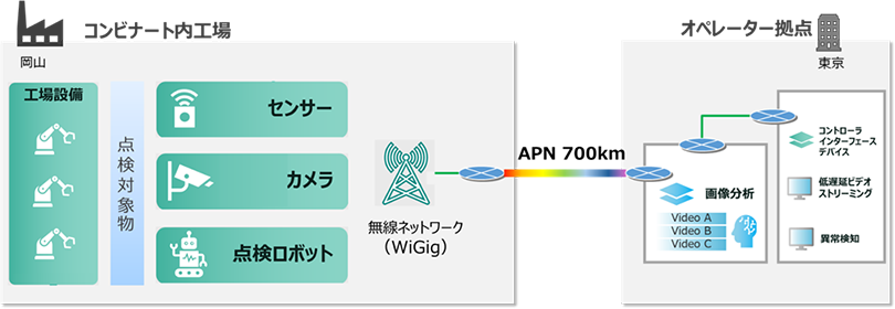 こうした課題の解決を目的として、2026年2月に、IOWN® APNと60GHz帯無線LAN(WiGig注2)を活用した大容量・低遅延通信環境の構築について、岡山県の水島臨海工業地帯(水島コンビナート)において検証を実施しました。