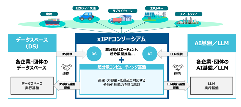 「xIPFコンソーシアム」は、超分散コンピューティング基盤と、企業や団体が持つAI基盤やLLM(大規模言語モデル)や、データスペース注2を連携させて、分散した環境下のAIとデータを安全かつ柔軟に連携させて活用できる社会基盤(AIスペース)の実現をめざします。これにより、日本の産業や社会が抱えるさまざまな課題の解決を後押しして、物流やモビリティ、エネルギー、まちづくりなどの幅広い分野でAIを活用した新たなサービスや価値の創出を推進します。また、取り組みの推進に当たり、産業界が主体となって行政・学術機関と連携し、異業種間のデータ連携を促進するとともに、国際的な動向を踏まえながら、日本発の先進的なモデルを国内外へ発信していきます。