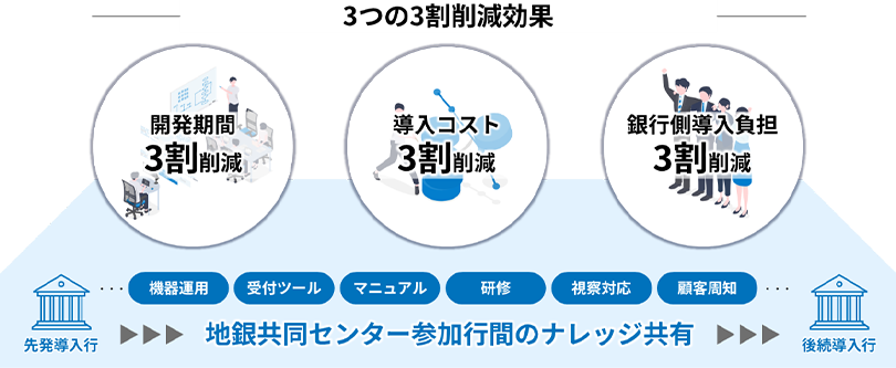 京都銀行、千葉興業銀行、岩手銀行、池田泉州銀行、あいち銀行、福井銀行、青森みちのく銀行、秋田銀行、四国銀行、鳥取銀行、西日本シティ銀行、大分銀行、山陰合同銀行 - 注3 本効果は、従来の銀行専用の営業店システムを個別に構築する場合と比較した、本ソリューション自体の導入効果を示したものです(共同利用型サービスとしての提供による効果は含みません)。地銀共同センター参加行および中規模地方銀行を対象にNTTデータが試算しており、更改前の機器構成や専用端末の台数等により効果は異なります。