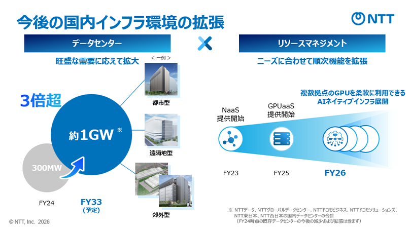 NTTは、データセンターの旺盛な需要に応え、現状のIT電力容量約300MWから2033年度に向けて3倍超の約1GWに拡張する予定です。また、お客さまのニーズに合わせて複数拠点のGPUを柔軟に利用できるリソースマネジメント機能等を順次拡張していきます。