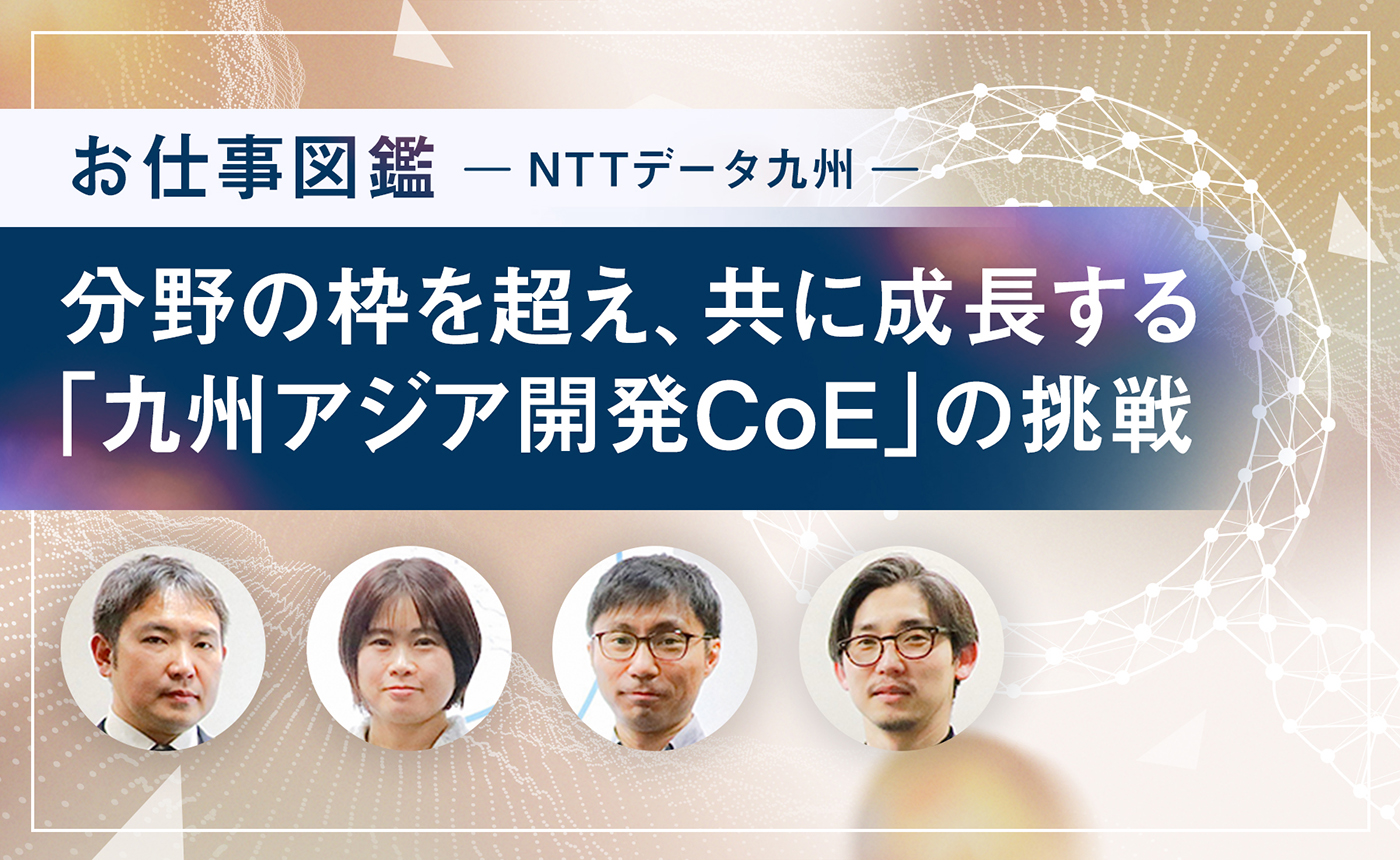 NTTデータ九州の「九州アジア開発CoE(Center of Excellence)」は、高度な専門性を持つIT人材を育成し、拡大するIT需要に応えていくために生まれた組織です。2025年の発足以来、金融分野で培った高品質なシステム開発のノウハウや、自治体・地域企業・大学などの領域におけるナレッジを集約し、人材交流によるシナジー創出を目指しています。中国・ベトナム拠点との連携も強化し、「九州・アジアに挑戦できる」環境づくりにも取り組む同組織。その現在地を、4名のエンジニアへのインタビューからひも解きます。