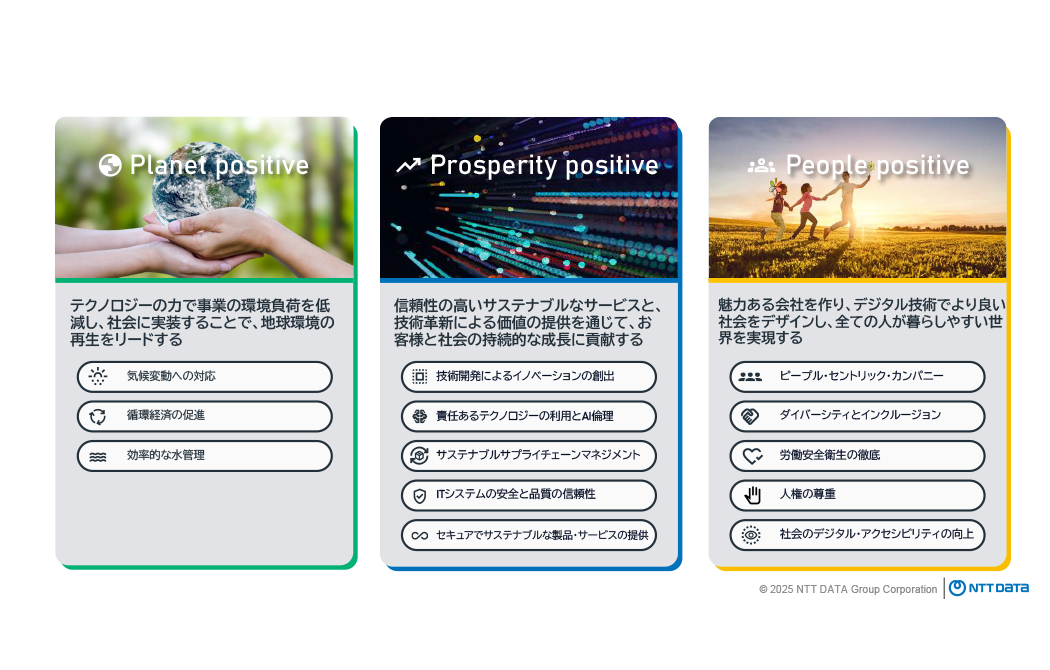 今回の13のマテリアリティは、NTT DATAのミッションや今後の事業成長への思いが込められた内容にリニューアルされているので、ぜひ多くの方に認知してほしいですね。