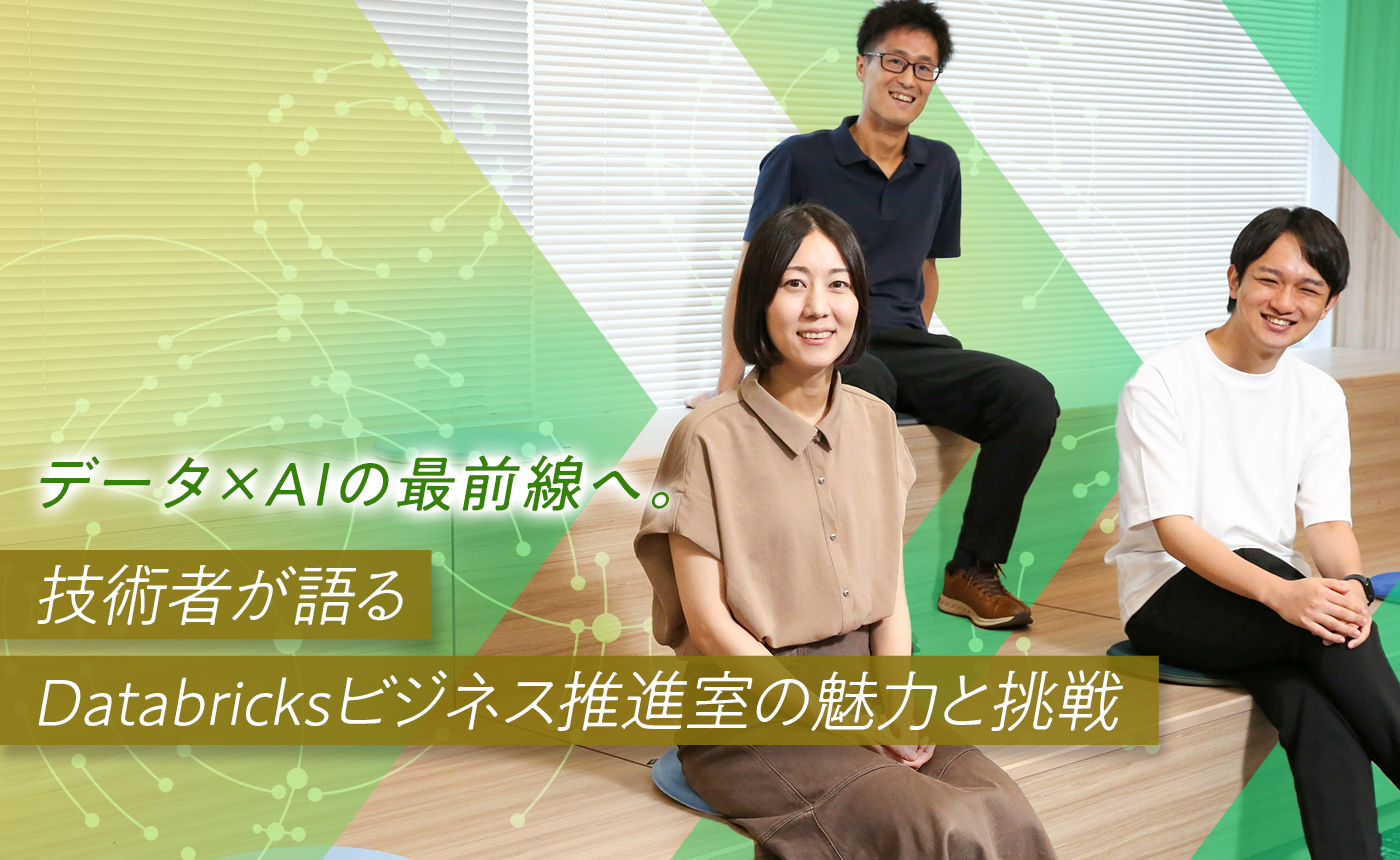 データ、AI、クラウド。Databricksビジネス推進室のメンバーは、AI時代の最前線で各々が異なるスペシャリティを発揮しながらも、互いに助け合い、高め合うことで、個人の力量を超えた価値提供を実現しています。「データ・AIの民主化」を目指す挑戦は、お客様のビジネスや社会の変革を加速するだけでなく、メンバー一人ひとりの成長にも大きなインパクトを与えるはずです。