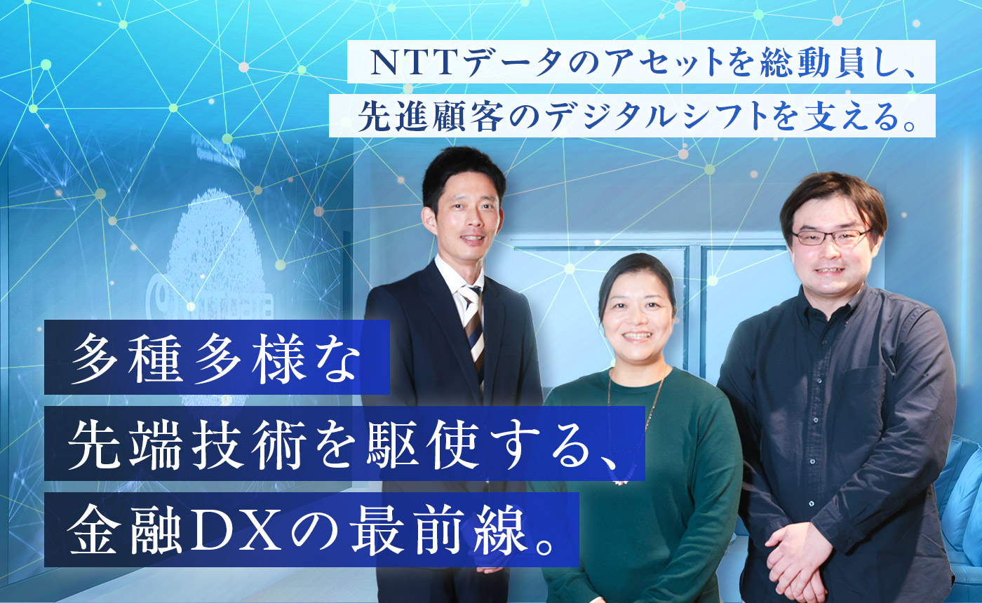 既存の枠組みにとらわれず、その時々の最先端のテーマとお客様の課題に真っ向から挑み続けているメンバーたち。その言葉からは、変化を楽しみ、仲間とともに未来を切り拓く高揚感が伝わってきました。NTTデータという広大なフィールドを活かし、どのように金融の未来を創っていくのか。ここには無限の可能性が広がっています。