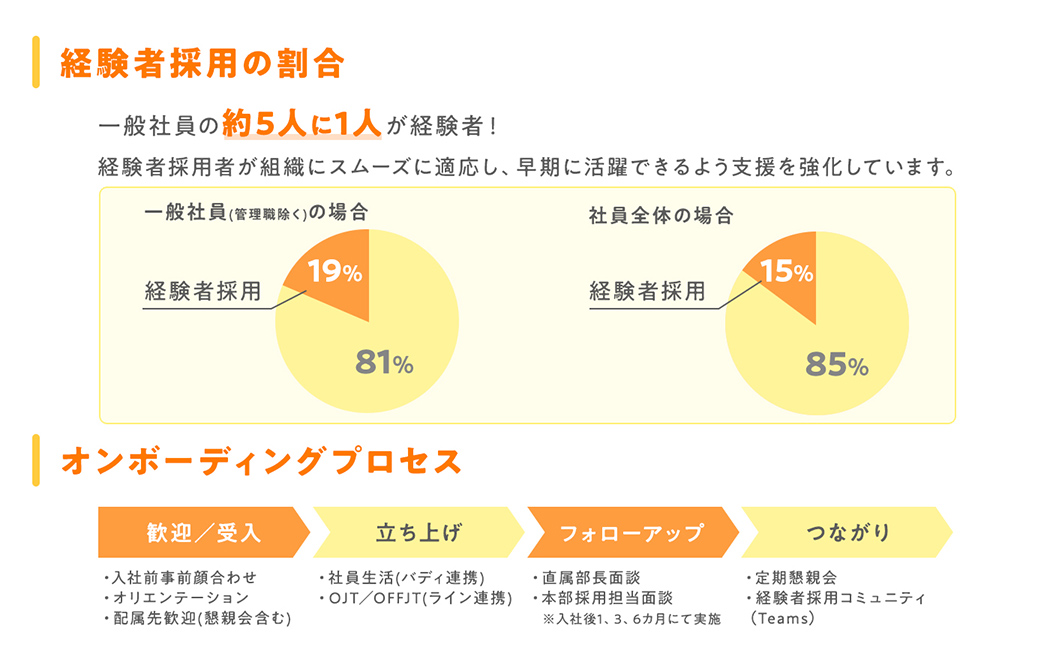 経験者採用をはじめ、社内外から継続的に新しいメンバが参画する環境です。そのため、担当部署内ではプロジェクトの先輩社員がオンボーディングを担当し、社内関連のサポートを行ってくれる「バディ」が付きます。