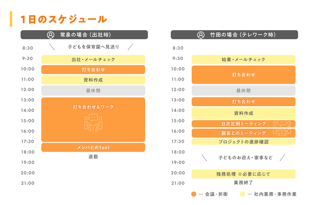 テレワークとオンサイトによる柔軟なハイブリッドワーク環境において、日常的なコミュニケーションはチャットツールとWeb会議がメインです。オフィスはフリーアドレス制で、個室ブースやソファ席などもあり、集中作業からカジュアルな打ち合わせまで幅広いスタイルに対応しています。働く場所に依存せず、その人ごとの状況に合わせた働き方ができます。(常泉)