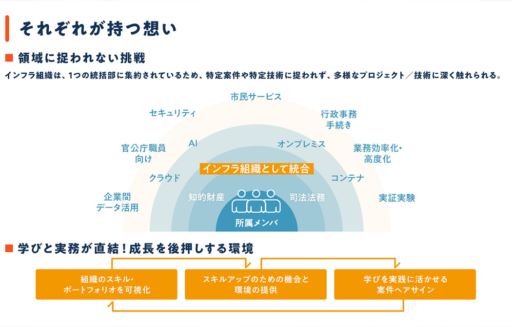 インフラ組織を集約したことにより、多様なプロジェクトや技術に触れながら、メンバ一人ひとりが実践経験を積みながらキャリアを深めたり、幅を広げたりすることができます。