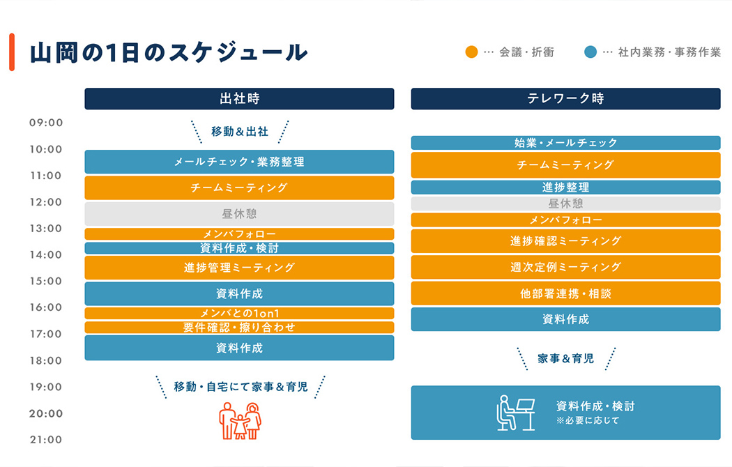 例えば、始業前にプライベートの予定を済ませてから勤務を開始するメンバもいますし、私自身も家事や育児と両立しながら業務を行っています。(山岡)