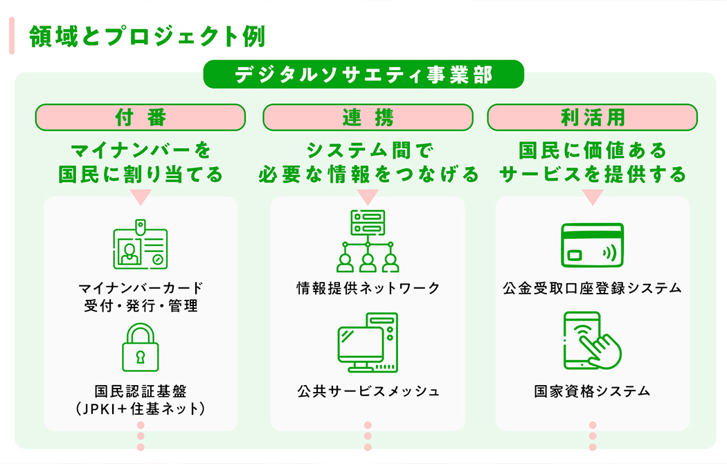 デジタル庁や地方公共団体の共同法人を顧客とする、マイナンバー関連システムの仕組みの検討やプロジェクトマネジメントが主な業務です。