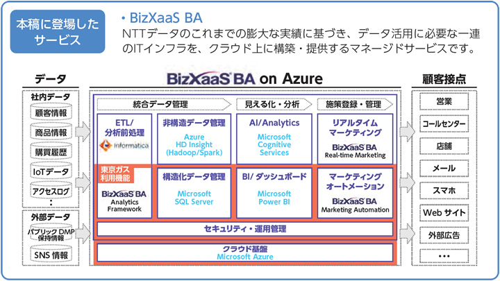 さらに加えて、マーケティングPDCA確立に向けては、基盤構築と活用を両輪で進め、「小さく速やかに始めて、使いながら育てる」ことをコンセプトとして掲げた。こうしたさまざまな要件を踏まえて同社が採用したのが、インフラとしてNTTデータのクラウド型情報活用基盤提供サービス「BizXaaS BA」、活用面については、同じくNTTデータの「データ活用KPOサービス」だったのである。