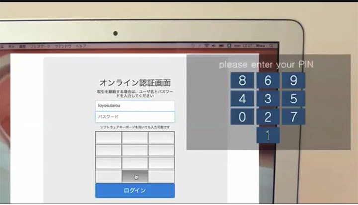 また、ウェアラブルデバイス利用者の認証を行うAR認証技術を開発しました。スマートグラスに表示されたピンパッドに対して指をかざすことで暗証番号の入力が可能となります。この技術もピンパッドの配列は本人以外見ることができませんので安全に暗証番号を入力することが可能です。本技術はITpro EXPOに出展して大好評を博しました。
