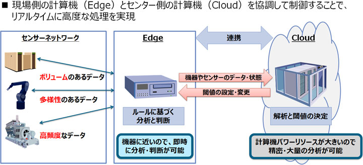 その中でもエッジコンピューティングが重要な要素となる。エッジコンピューティングとは、センサーの設置現場やユーザーの近くなどに設置したエッジ機器で演算処理(Edge)を実行し、データセンター側の演算処理(Cloud)と協調して制御することで、より低遅延で高度な処理を実現する技術である。例えば、エッジコンピューティングの技術が求められるケースとして、コネクティッドカーがある。自動車の制御など、より即時性が求められる処理には自動車内や自動車の近くの通信基地局等に設置されたエッジ機器で処理を行い、大量データを分析するような複雑な処理については、クラウド側で処理を実施することになる。