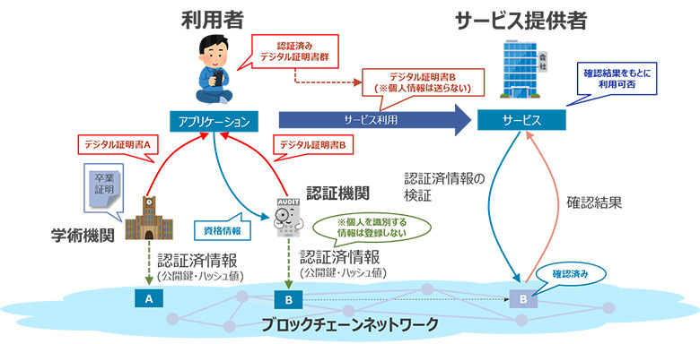この認証情報を流通させる仕組みとしてブロックチェーンを利用します。証明書発行元は認証した情報をブロックチェーンに記録します。ブロックチェーンの特徴である耐改ざん性によって、認証情報が誰かに改ざんされることを防ぎます。また、ブロックチェーンネットワークが多くの利用者によって構成されていることで、サービスごとにネットワークを組む必要もなく、様々なサービスに容易に組み込めることになります。(図)
