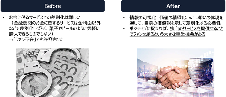 一つ目は「金融サービスにおけるwill(想い)の体現」です。お金のデジタル化が進むことで、お金の情報を可視化したり、価値を精緻化したりすること、willを込めたりすることが可能となりました。こうした中、金融機関が最終的な数字の価値だけを拠り所にせず、数字以外の価値を仲介するニーズは高まると考えられます。「どこの銀行も同じ」という「ファン不在」の現状を変える。そのためにはデジタル化したお金の特性を生かし、より柔軟性をもって、自らもwillをベースにサービスを構築し、自身の価値観を示して差別化していくことが必要でしょう。ポジティブに捉えれば、独自のサービスを提供することでファンを創れる大きな事業機会があるともいえます。
