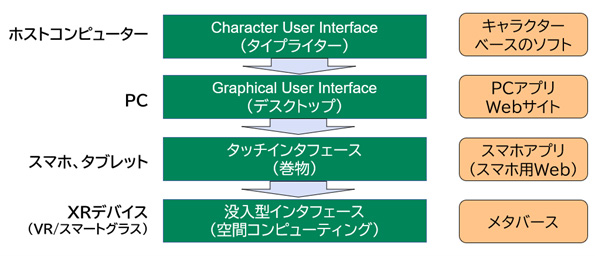 このように、これまでの歴史を見ても、次のコンピューティングデバイスはAR/VRになるのが必然であるということができるでしょう。そしてコンピュータが進化するのに合わせて、それを利用するためのインタフェースも進化してきました。XRデバイスにおけるコンピューティングは没入型インタフェースとも空間コンピューティングとも呼ばれており、そのうえで動作するアプリケーションこそがメタバースであるということができるでしょう。(図4)