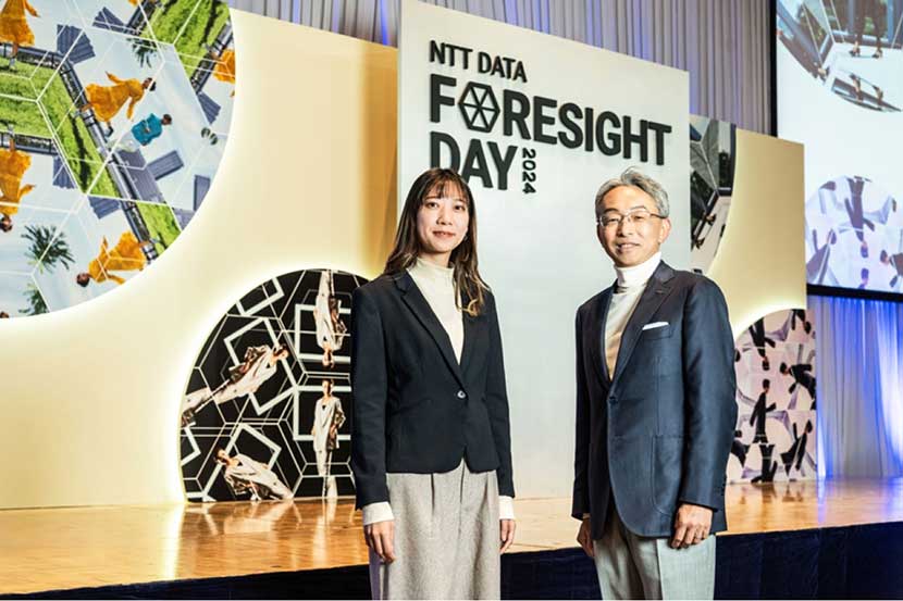 NTTデータが2024年1月26日に開催した「NTT DATA Foresight Day 2024」にて、NTTデータ代表取締役社長・佐々木裕と、社会課題の解決を目指すtaliki代表取締役CEO・中村多伽のトークセッションが行われた。