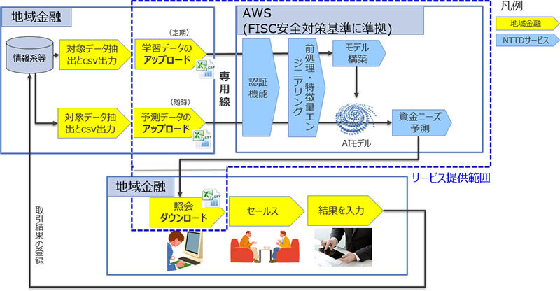 金融機関は、自分たちの持つデータをクラウドセンターにアップロードするだけで、AIモデルによってスコア化された顧客ごとの資金ニーズなどの予測が得られ、訪問先の選択などの営業活動に活用することができます。(図1)