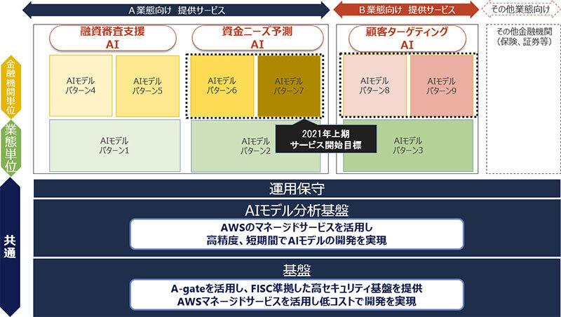 信用金庫や信用組合などの地域金融機関で単独で基盤やAIモデルを構築するのは負担が大きくなります。また、分析するための情報も業態によっては、収集しているデータ構造に差異があり、同じ業態内でデータ構造が同じでも個別金融機関によって中身の情報には差異があるため、個別事情に応じたモデルを構築していく必要があります。そこで、パブリッククラウド上に安全対策基準(FISC)に準拠したセキュアなAI分析プラットフォームを構築(社内開発した「A-gate®」※1を活用)し、業態や個々の金融機関に応じたAIモデルを「安く」「早く」「高精度なAIモデル」の実現を検討していくこととしました。