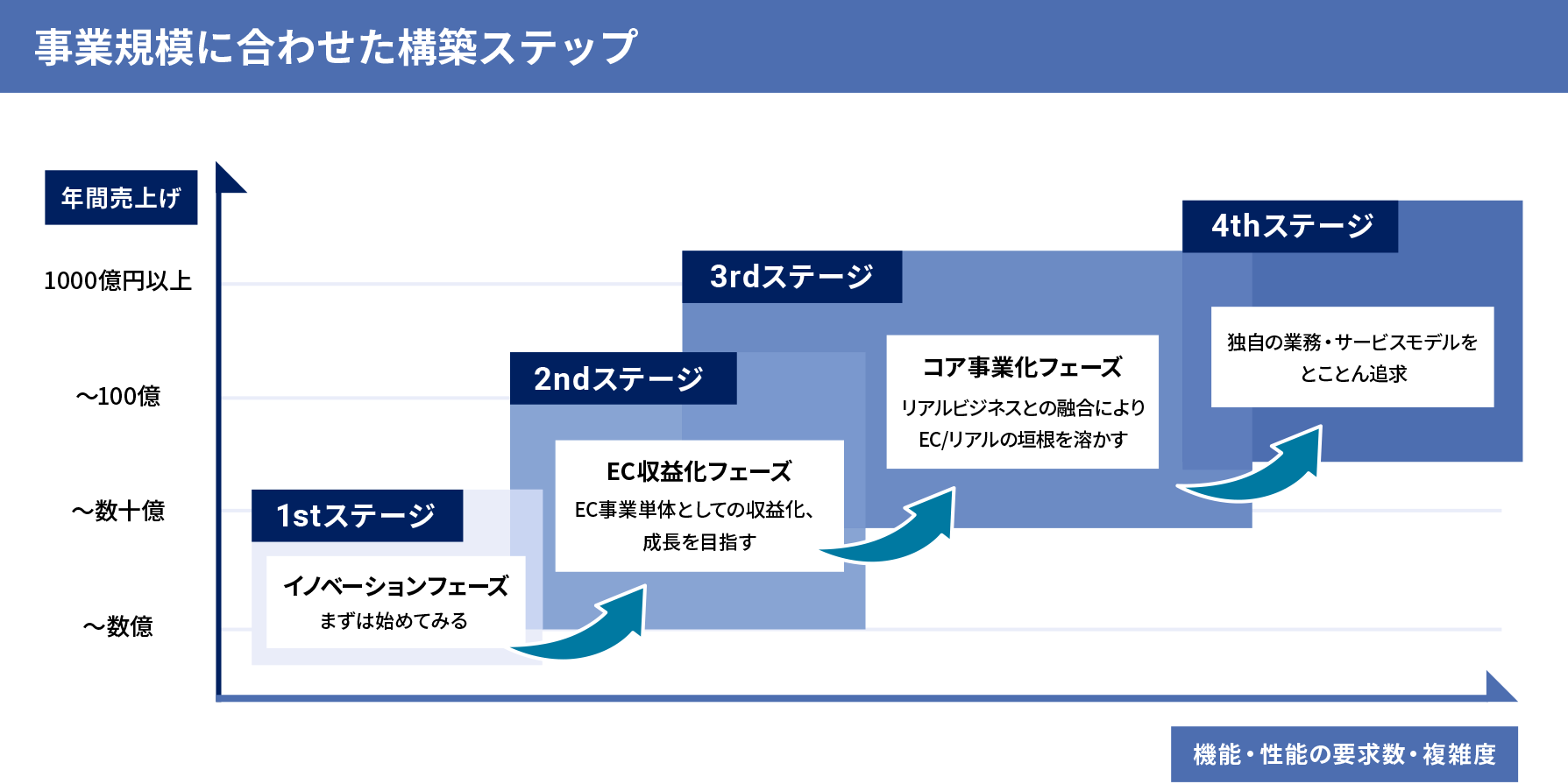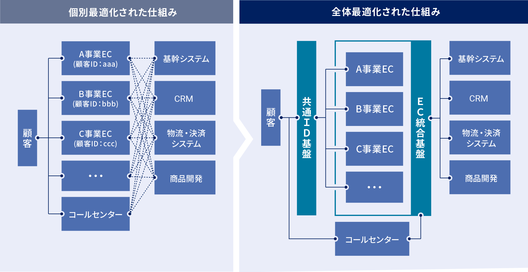 その際、各商品・事業ごとにECサイトを構築するのではなく、フロントシステムの柔軟性は保ちつつもバックヤードの基幹システムとの連携や共通ID基盤等、全体最適を考えたグランドデザインと、事業規模に合わせた最適な開発投資の組み合わせが重要です。