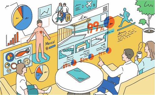 例えば、日々の生活に様々なサービスが自然に組み込まれることで、一人ひとりのウェルビーイングな暮らしがスムーズに進む未来 -