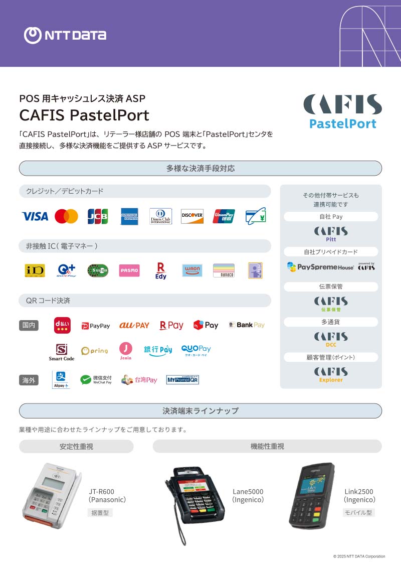 リテーラー様店舗のPOS 端末と「PastelPort」センタを直接接続し、多様な決済機能をご提供するASP サービス、CAFIS PastelPortのご紹介リーフレットです。