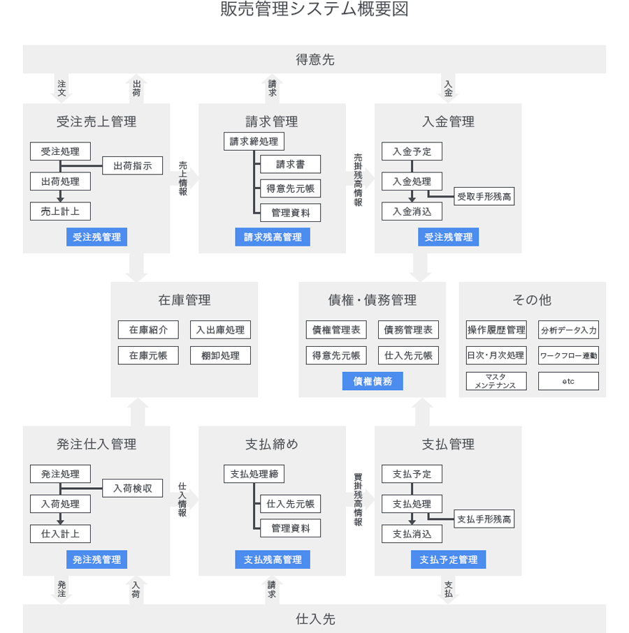 様々な業種・業態のお客様が利用可能です。(商社型・プロジェクト型・食品製造(粉もの・液体)型テンプレートあり) 受注出荷売上、発注仕入、在庫、請求入金、債権、債務、支払、配賦、リベート、棚卸