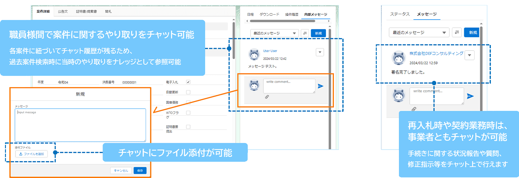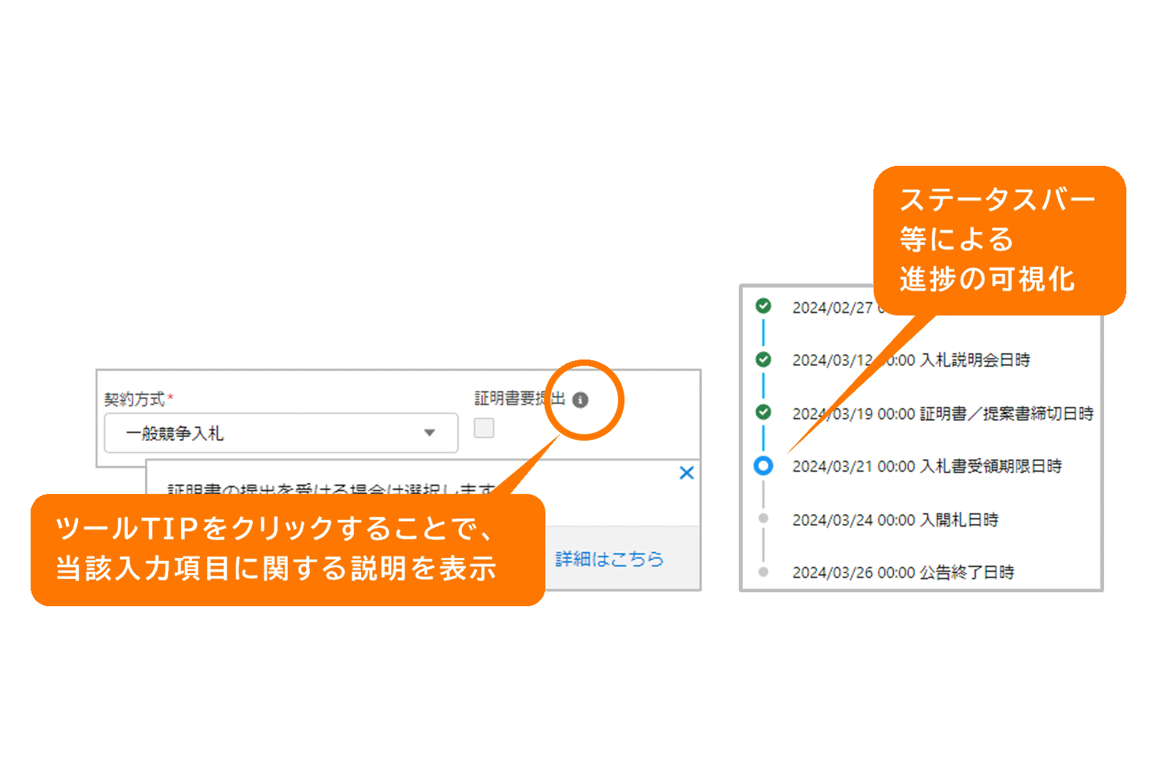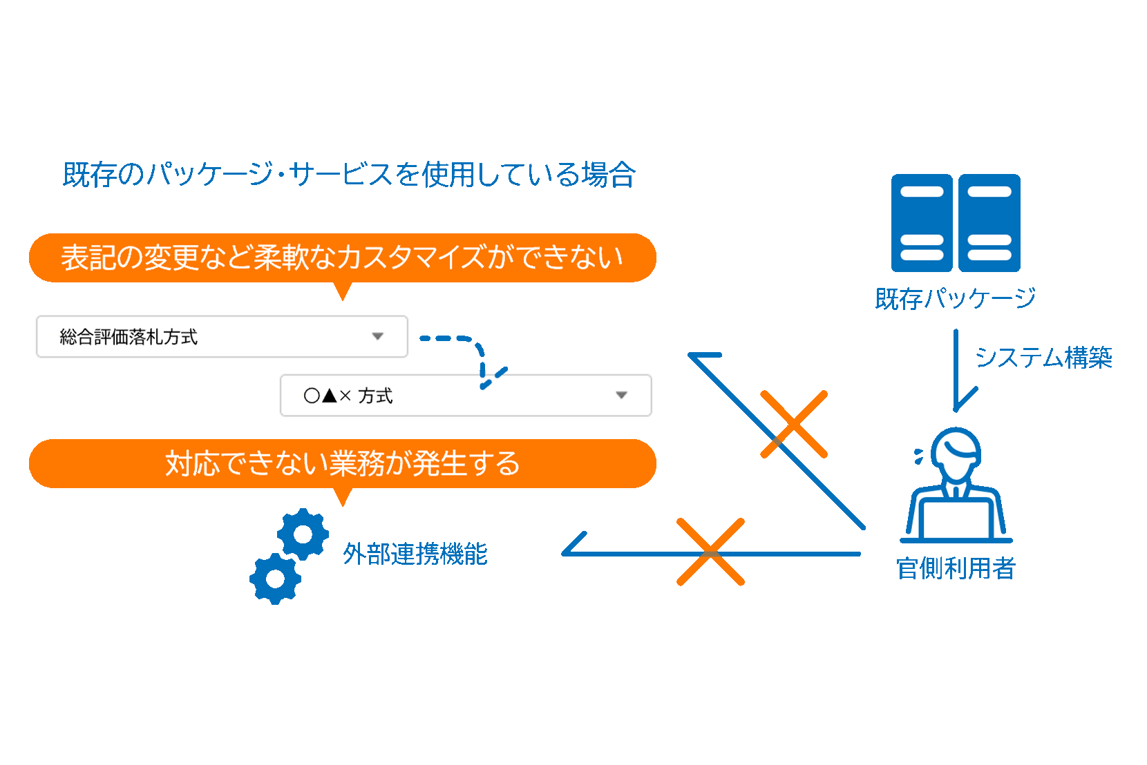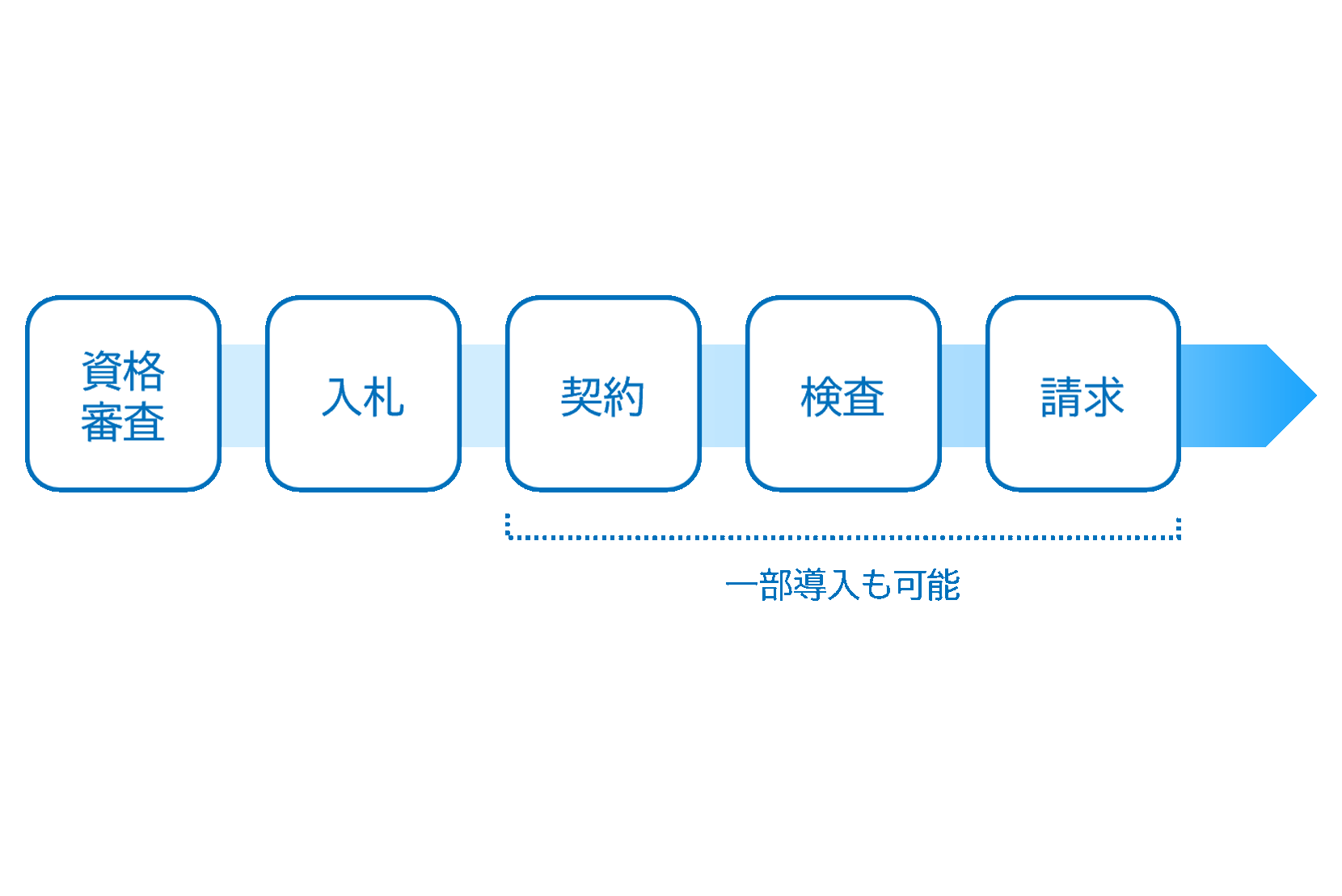 本サービスは、自治体様向けに構築した24時間365日稼働する電子調達サービスとなります。公共工事と物品・役務それぞれにおいて、資格審査・入札・契約・検査・請求の全調達業務をデジタル化し、残存する紙の業務やICカード発行等に係る手間・コスト削減を実現します。契約等、一部機能のみを切り出して提供することも可能です。