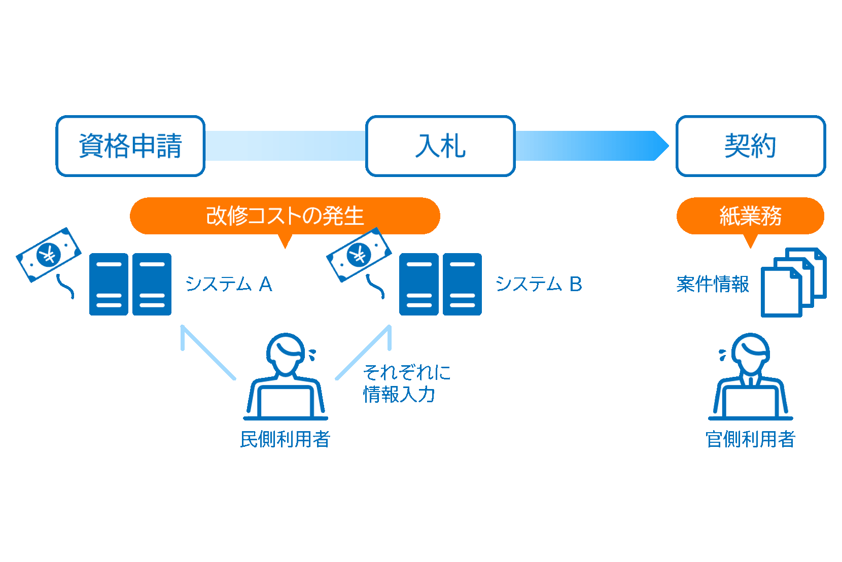 - 業務毎にシステムが混在することでシステムコストの増大や重複入力といった課題が発生