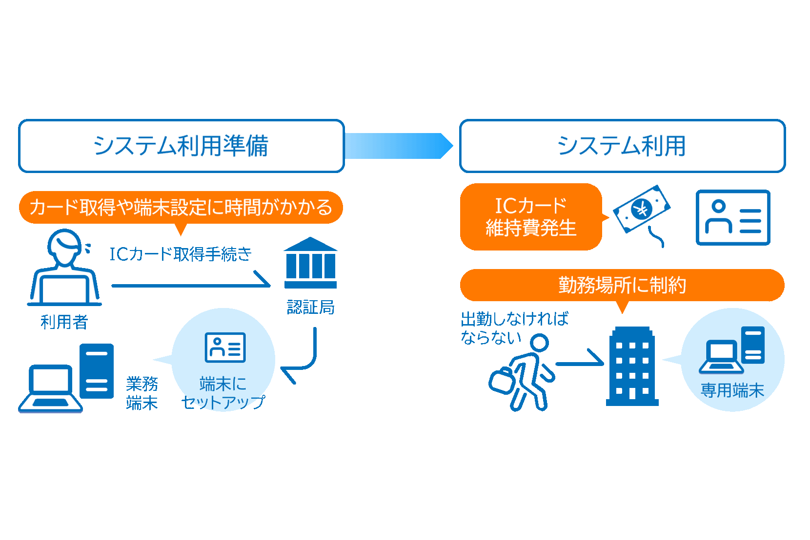 - ログインや電子署名にICカードを利用するため、ICカード取得や端末設定の手間が発生するうえ、業務可能な端末に制約が発生