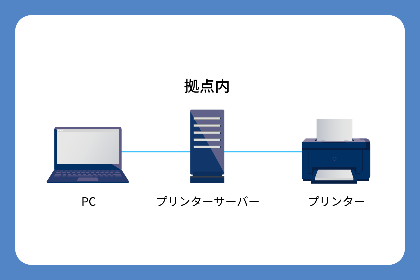 オンプレミスの印刷サーバーを経由し、同一ネットワーク内でプリンタ制御やジョブ管理を行います。