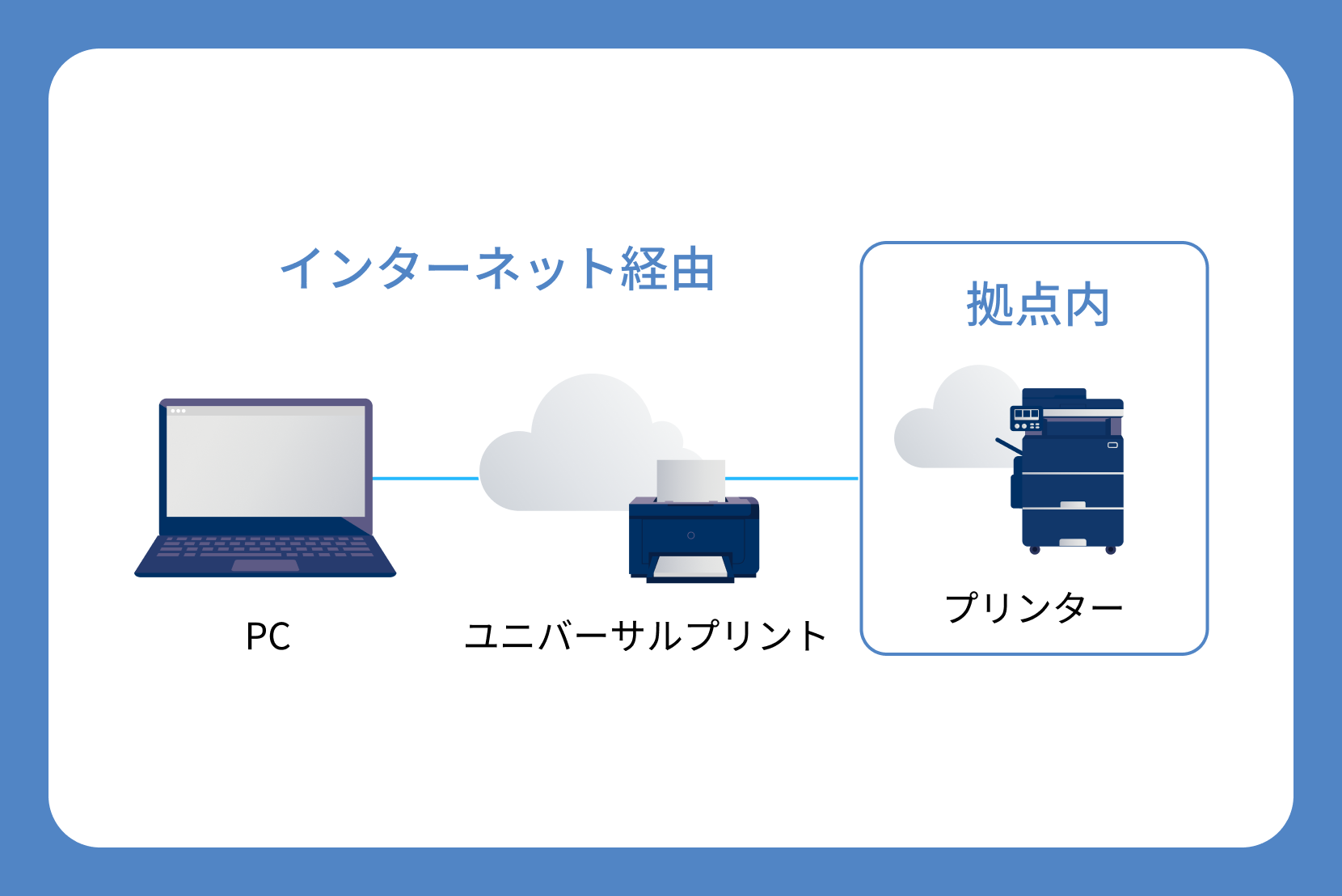 クラウド上でプリンタの制御・ジョブ管理を行う方式。