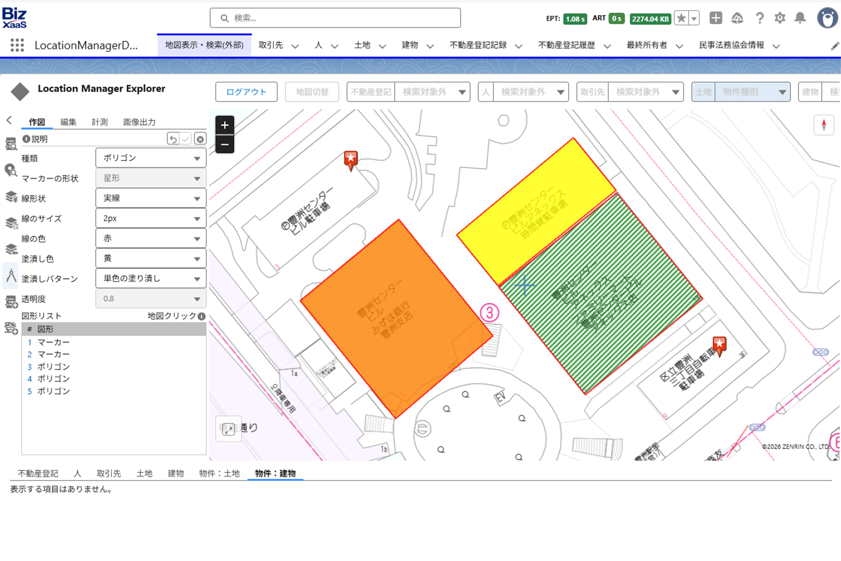 不動産物件情報を一元管理することが可能で、物件の取得、売買にあたり、周辺施設情報や用途地域、地価情報などを確認できます。さらに、不動産登記を取得し、地権者情報を確認して、人と土地の地理情報を紐づけて可視化することができます。