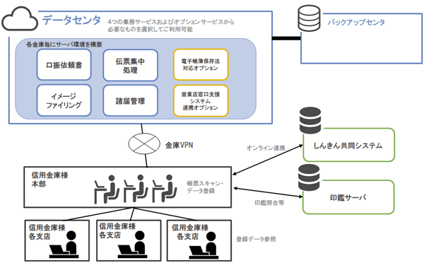 営業店後方事務の本部集中化をサポートし、営業店事務のスリム化および本部のローコストオペレーション化を実現するサービス。「口座振替依頼書サービス」「イメージファイリングサービス」「伝票集中処理サービス」「諸届管理サービス」から必要なサービスを選択しご利用いただくことができます。サーバはデータセンターに設置するため、業務継続性を確保できるほか、お客さまのサーバ管理稼働等のコストを削減することができます。