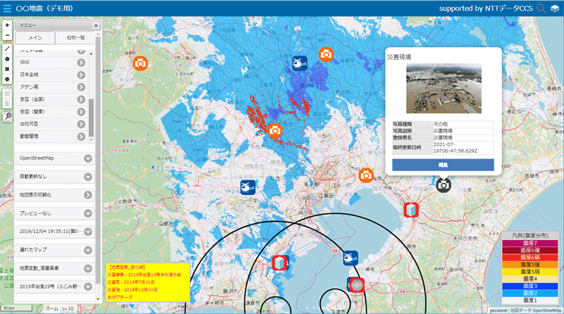 NTTデータCCS社「geoassist®」により、地理情報を切り口とした共通状況図を提供。