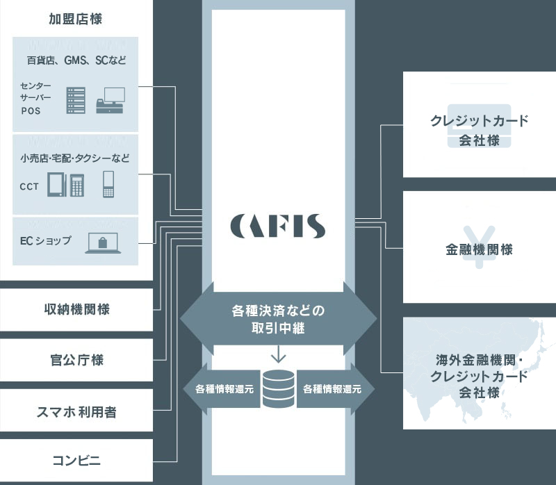 CAFIS(キャフィス)は、接続社数・取引量ともに日本最大級のキャッシュレス決済プラットフォームです。1984年からサービス開始し、40年にわたって日本のキャッシュレス市場を支えてきた豊富な運用実績を持ちます。クレジットカードのみならず電子マネーやインバウンド決済、QRコード決済など時代に即した新たな決済手段に迅速に対応しています。
