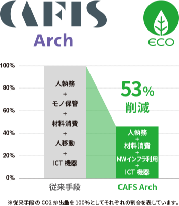 CAFIS Archでは、クラウド型サービスの利用や各種業務の電子化を通じて、「紙の使用」、「モノの移動」、「人の稼働」の削減が可能となります。NTTグループの試算結果では、サービス導入前と比べて年間約53%のCO2排出量削減につながります。