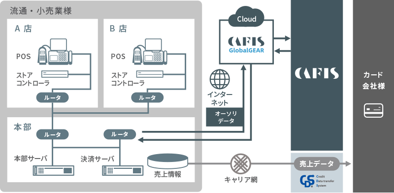 加盟店様の決済サーバとCAFISをIP専用線等で接続し、クレジットカードの与信照会等をオンラインで処理するサービスです。加盟店様よりのお取引を、リアルタイムにカード会社様等へCAFISが中継します。