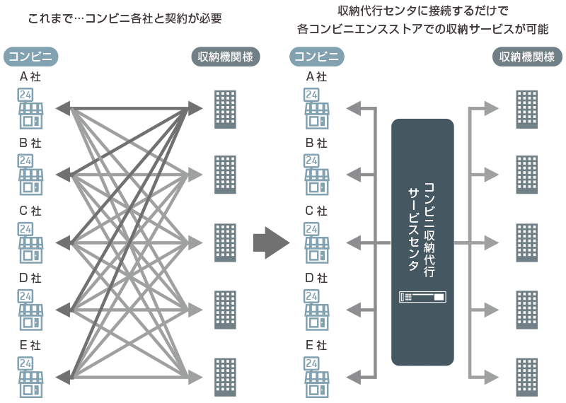 コンビニエンスストアでの料金収納を可能にするサービスです。当社が運営するASP型の収納代行サービスセンターをご利用いただくことで、24時間365日全国5.8万店舗のコンビニがお客さまの支払窓口となります。各コンビニ本部とのシステム接続は不要で、収納金も弊社が取りまとめるため、簡易に導入でき、運用後のコスト低減が図れます。
