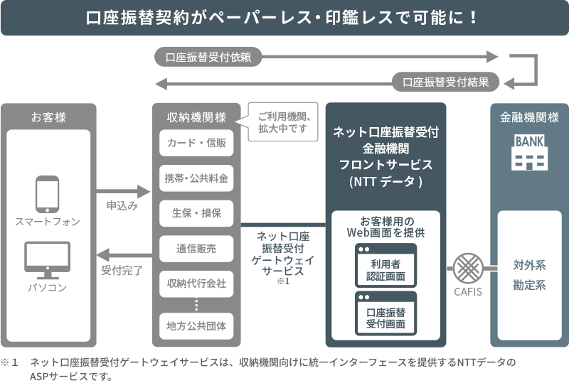 インターネットで口座振替契約手続きを実現可能とするための、金融機関向けのASPサービスです。金融機関は、既存の決済インフラの活用、本サービスが提供する利用者向け手続き画面のご利用により、自機関で構築するよりも容易に導入でき、収納機関へサービス提供することができます。口座振替依頼書の書類手続きが不要になるため、利用者・収納機関・金融機関ともに口座振替手続きの利便性が向上します。