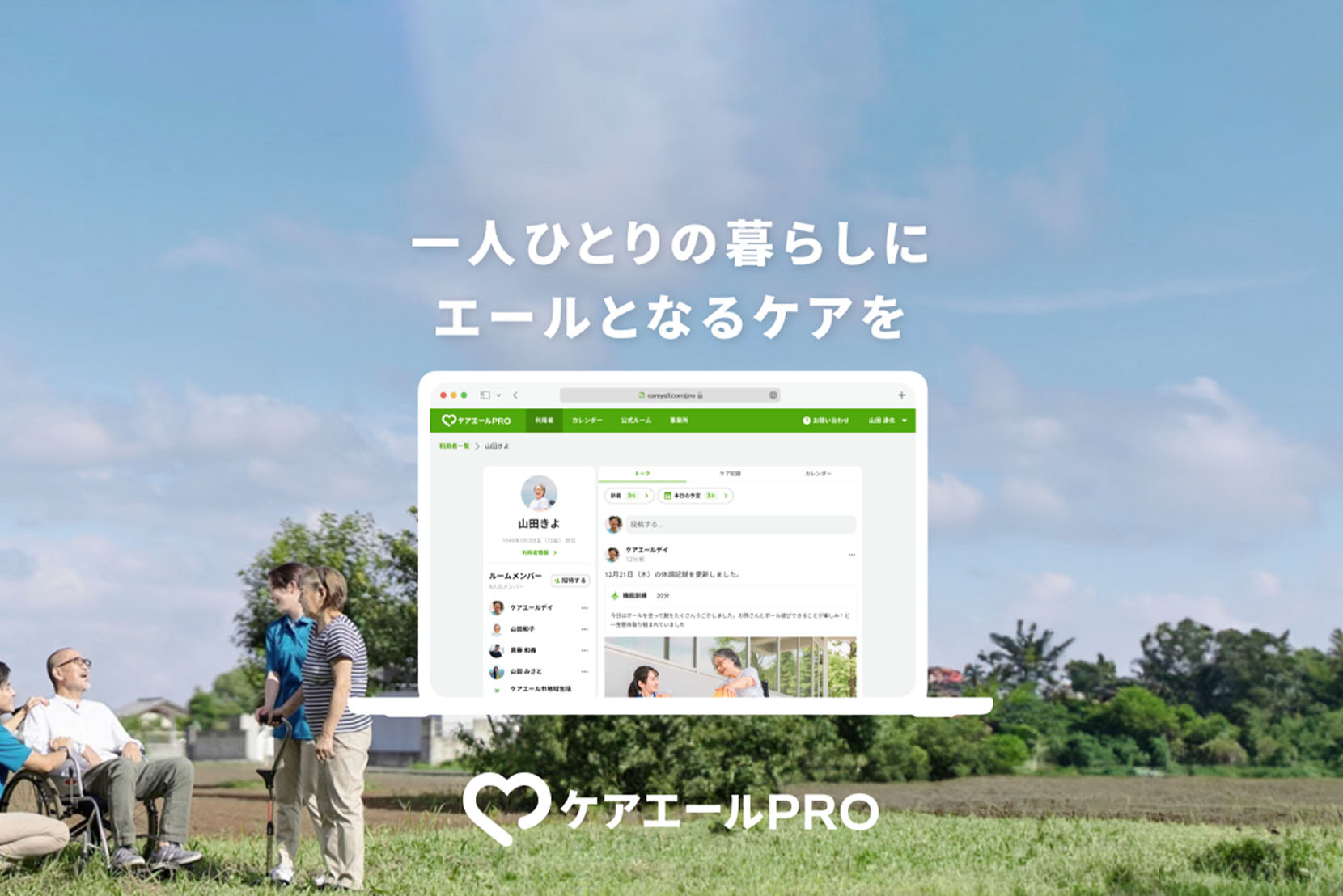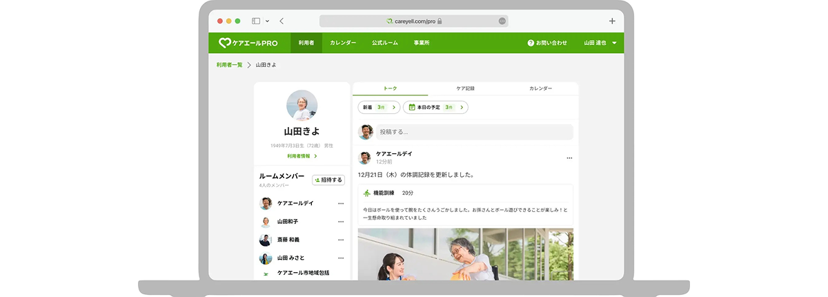 ケアエールPROは、利用者一人一人のリアルな今を家族や関係者と共有しながらチームケアを円滑にし、たまったデータをサービス記録として活用できるサービスです。