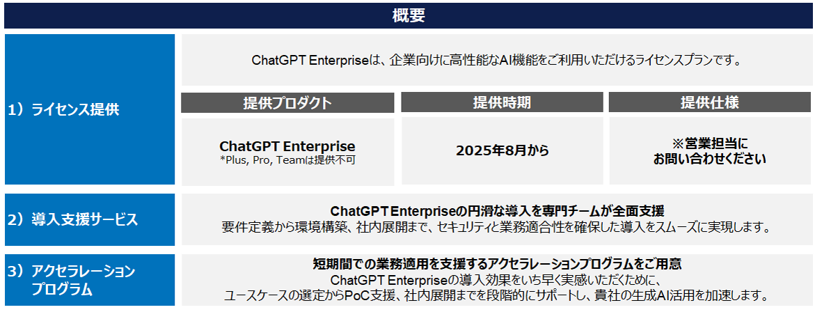 A ChatGPT Enterpriseは、OpenAIから提供される機能(セキュリティ、SSO、無制限GPT-4など)と同等です。加えて当社では、導入・活用支援プログラムを独自に提供し、貴社内での定着と成果創出を強力にサポートいたします。